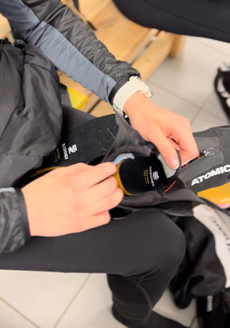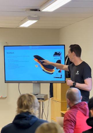 Teamet fick lära sig om hur SlimTech-sulan är speciellt framtagen för skor som sitter relativt tight, och om vilken effekt som sulan kan ha för prestationen genom att den dämpar och stödjer foten på rätt sätt under åkningen. SlimTech-sulan har en smal profil, är uppbyggd i tre olika höjder för hålfoten och har extra dämpning i hälen. Den passar perfekt i en längdåkningspjäxa med relativt tight passform.